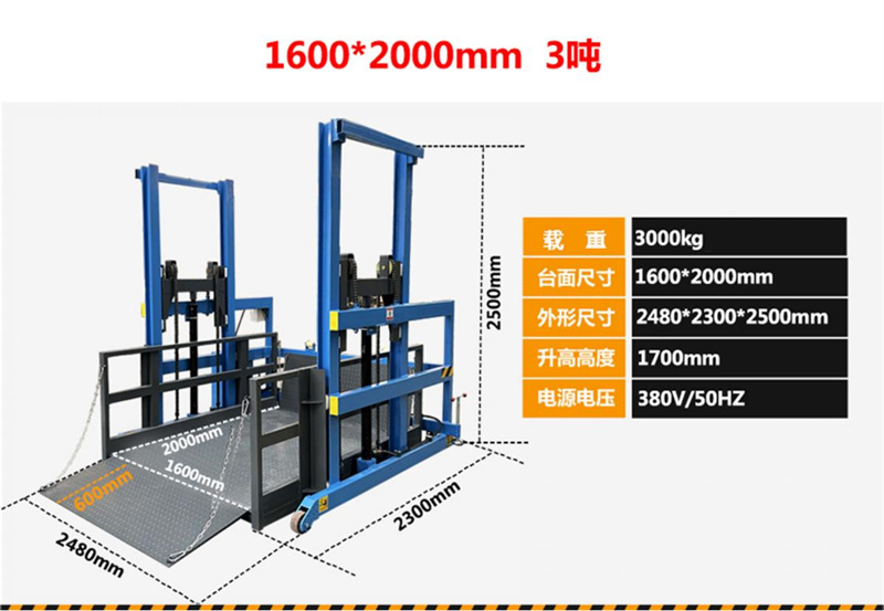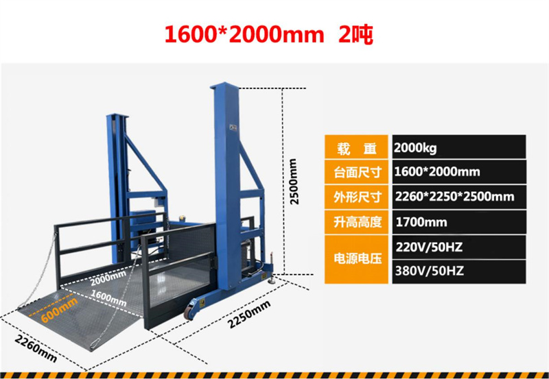 6.液壓系統及電器控制系統安裝在該設備側面,便于維修及預防車輛在裝載貨物倒車時頂撞到該電控箱,7.選用交流380V或220V電 壓為動力電源(用戶需在訂購時預先選定)充分體現設計結構更合理實用。